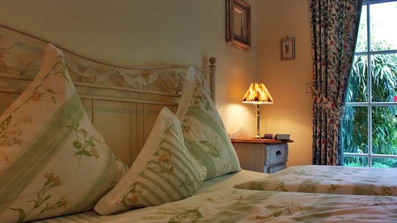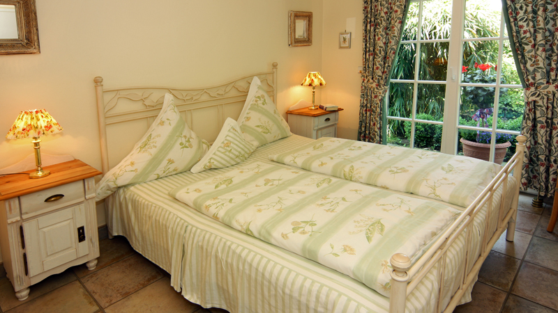 Der Wohnraum im Stil und den Farben der Provence, so wie das Schlafzimmer mit Blick in den Garten und auf den Teich ergänzen den Charme des Häuschens.