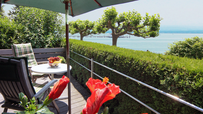 Eine überdachte Terrasse mit Sitzplatz, sowie eine offene Sonnenterrasse direkt zum See, bieten eine Oase der Ruhe und Entspannung.